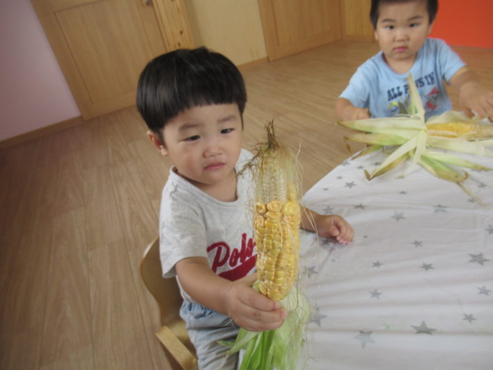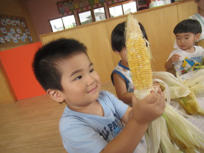 トウモロコシの皮をむいてみたり、しそジュースを作って飲んだり